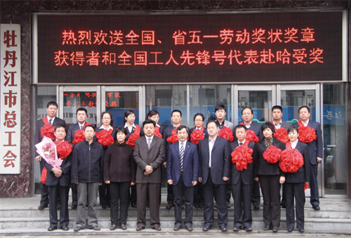 4月27日晨,市總工會主席姚壽鵬、市政府秘書長周景隆在市總工會門前為榮獲全國、省五一勞動獎的全體人員送行,并合影留念。 姚主席、周秘書長分別發(fā)表了熱情洋溢的講話,并祝獲獎?wù)唔樌淇欤瑫r也展現(xiàn)出牡丹江人的精神風(fēng)采。