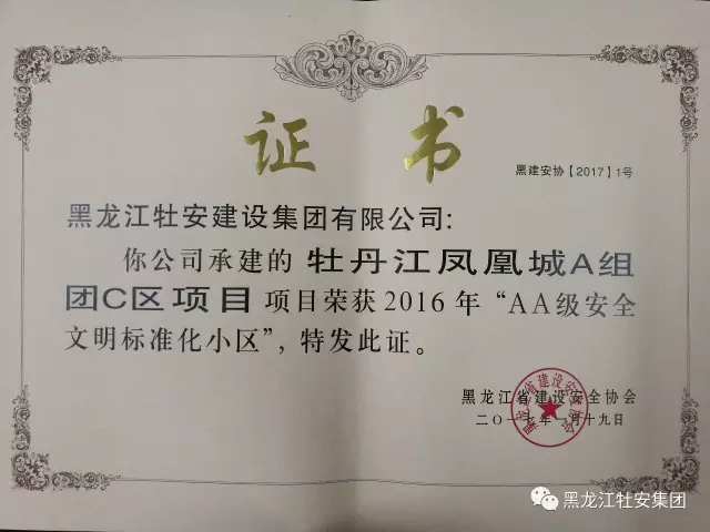 日前,由我公司承建的牡丹江鳳凰城A組團(tuán)三期(卡路屯棚戶區(qū)改造工程)項(xiàng)目和牡丹江鳳凰城A組團(tuán)C區(qū)項(xiàng)目,被省建設(shè)安全協(xié)會(huì)評(píng)為2016年度“AA級(jí)安全文明標(biāo)準(zhǔn)化小區(qū)”。張化民、李強(qiáng)分別被授予“全省建設(shè)安全管理優(yōu)秀項(xiàng)目負(fù)責(zé)人”稱號(hào)。對(duì)獲得榮譽(yù)的同志表示祝賀的同時(shí),也希望他們?cè)诮窈蟮墓ぷ髦薪潋溄湓暝俳釉賲?,充分發(fā)揮典范作用,繼續(xù)做好施工現(xiàn)場(chǎng)安全文明標(biāo)準(zhǔn)化工作,加強(qiáng)安全生產(chǎn)和文明施工管理,推動(dòng)我公司安全文明標(biāo)準(zhǔn)化工作提升水平,再上新臺(tái)階。